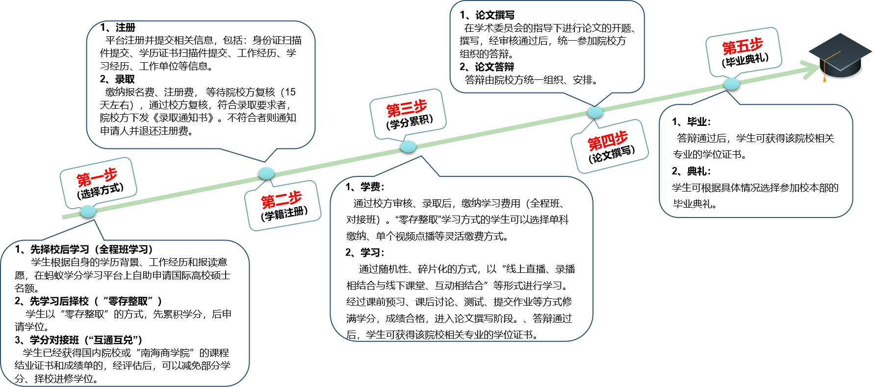 學(xué)生根據(jù)自身的學(xué)歷背景、工作經(jīng)歷和報(bào)讀意愿,在“南海學(xué)分”上自助申請(qǐng)國際高校碩士名額或博士名額。通過校方審核、錄取后,在平臺(tái)上以"線上直播錄播相結(jié)合與線下教學(xué)互動(dòng)相結(jié)合'等形式進(jìn)行學(xué)習(xí)。經(jīng)過課前預(yù)習(xí)、課后討論、測試、提交作業(yè),修滿學(xué)分、成績合格、論文撰寫、答辯通過后,學(xué)生可獲得該院校相關(guān)專業(yè)的學(xué)位證書,學(xué)位合金量與在校生完全等同。